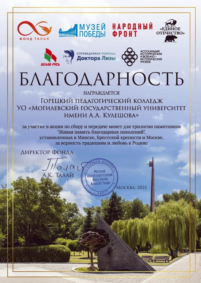 колледжей 2025/2026 учебного года. В ходе соревнований наша сборная команда девушек продемонстрировали ловкость и быстроту, выносливость и командный дух. Что помогло им сражаться в финале за призовые места !!! Результат не заставил себя ждать и девушки завоевали третье место! Трое учащихся (Чаусова А., Журова А., Красная А.) отобрались на областной учебно-тренировочный сбор по подготовке к республиканским соревнованиям! Поздравляем девушек и желаем покорения новых высот! 23 октября в общежитии 2 прошла конкурсная программа "Здравствуй, первокурсник", в которой приняли участие ребята-первокурсники Романовский Николай, Новиков Кирилл и Семченко Егор. Для ребят было подготовлено много интересных конкурсов, с которыми они справились на "отлично". В ходе мероприятия первокурсники смогли лучше узнать друг друга и почувствовать дух студенческой жизни. Каждый из присутствующих получил массу положительных эмоций. С целью адаптации и знакомства друг с другом 23 октября в общежитии №1 провели традиционный творческий вечер для первокурсников "Давайте познакомимся". В ходе мероприятия зрители смогли насладиться зажигательными, командными, творческими номерами, а также играми на сплочение коллектива. 23 октября с учащимися 1 курса прошло очередное мероприятие информационно-образовательного проекта «ШАГ» по теме «Быть достойным гражданином Республики Беларусь –значит чтить законы своего государства и брать на себя ответственность за будущее своей страны» (Конституция Республики Беларусь. Президент Республики Беларусь. Всебелорусское народное собрание. Ветви государственной власти. Государственные награды и премии). На мероприятие в 1"В" группу был приглашен преподаватель истории и обществоведения Хмарский А.И., который компетентно и грамотно ответил на все вопросы учащихся по тематике мероприятия. В рамках мероприятий, посвященных 80-летию Великой Победы 22 октября учащиеся 3 "Б" группы посетили Музей Славы Могилевщины. Музей Славы Могилевщины рассказывает об истории Великой Отечественной войны, довоенной и послевоенной жизни региона, а также о его современных достижениях. Учащиеся ознакомились с экспозициями музея. Совсем иначе понимается история, когда не просто смотришь на экспонаты, а погружаешься в историю довоенного и военного времени. В первом выставочном зале "Накануне. Могилевщина в 1930-е г.г." учащиеся смогли почитать газету, купить билет в кинотеатр. Но уже в следующем выставочном зале "Могилевщина в годы Великой Отечественной войны" совершенно иная атмосфера - страх и ужас. Особое впечатление на учащихся произвели ожившие с помощью нейросетей образы героев войны. Каждый вышел из музея с полным и глубоким осознанием происходившего на родной земле, чувством гордости за наш народ. 22 октября учащиеся и работники колледжа приняли участие в общественной акции по обновлению белорусских лесов «Дай лесу новае жыццё!». Акция по восстановлению лесов, приуроченная к Году благоустройства проходит в Беларуси с 11 по 31 октября. Особое внимание уделяется восстановлению участков, пострадавших от ветровально-буреломных явлений. Лишь совместными усилиями мы сможем обеспечить восстановление и устойчивое развитие лесных экосистем Беларуси. Будущее наших лесов – в наших руках! Горецкий педагогический колледж награжден благодарностью б